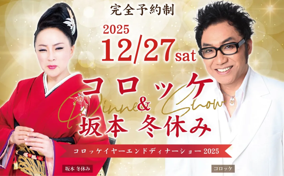 優雅なディナーと最高のエンターテインメントが融合するこの『コロッケ&坂本冬休み イヤーエンドディナーショー2025』。特別な日を記念に残す機会をお見逃しなく!ご予約はお早めに。皆様のお越しを心よりお待ちしております。