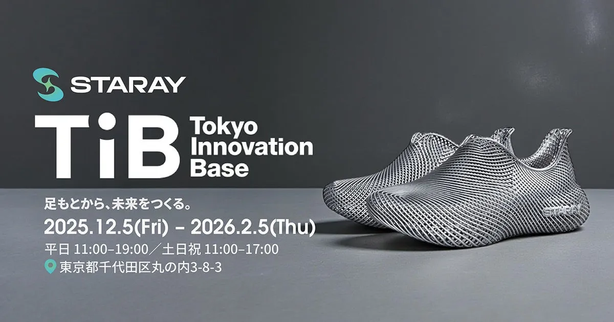 APPLETEE株式会社が展開する3Dプリントシューズブランド「STARAY」が、東京都のイノベーション拠点であるTokyo Innovation Base(TIB)の「TIB SHOP」に出店することが正式に決まりました。今回の出店は、2025年12月5日(金)から2026年2月5日(木)の2ヶ月間、TIB内のSHOPエリアで展示・販売を行う予定です。