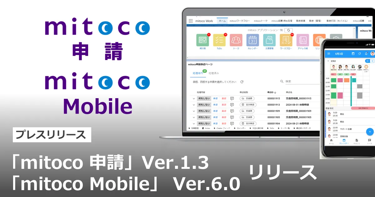 株式会社テラスカイ(本社:東京都中央区)が10月29日(水)に、Salesforce上でのビジネスワークフローを助ける「mitoco 申請」のバージョン1.3と、モバイル用アプリ「mitoco Mobile」のバージョン6.0をリリースしました。これらのアップデートにより、ユーザーはさらに効率的に業務を進められるようになっています。