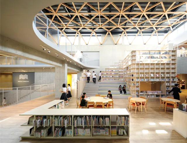 この学校の最大の特徴は、「メディアコモンズ」と呼ばれる吹抜け空間の存在です。このスペースは図書館機能をはじめ、通路や発表の場としても利用される多目的エリアです。異学年交流の促進や、協働学習の仕組みを取り入れることによって、子どもたちが自主的に学び合う環境が整っています。さらに、在校生が自分たちでサインを作成することで、学校に対する愛着を育む仕掛けも施されています。これにより、サイン作りはこの学校の伝統として受け継がれていくことを期待されています。