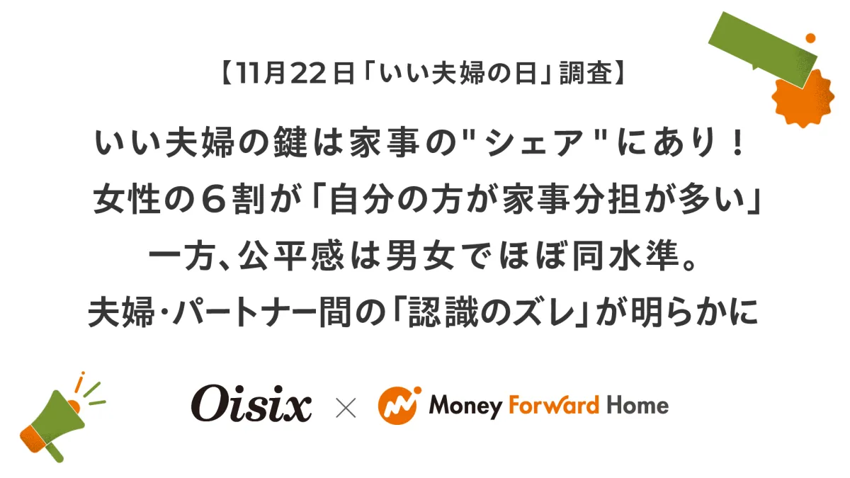 11月22日、「いい夫婦の日」を迎えるにあたり、マネーフォワードホーム株式会社とオイシックス・ラ・大地株式会社が共同で実施したアンケート調査が注目を集めています。この調査は夫婦やパートナー間での家事分担についてのもので、特に家計管理を含む家事の分担意識に焦点を当てました。