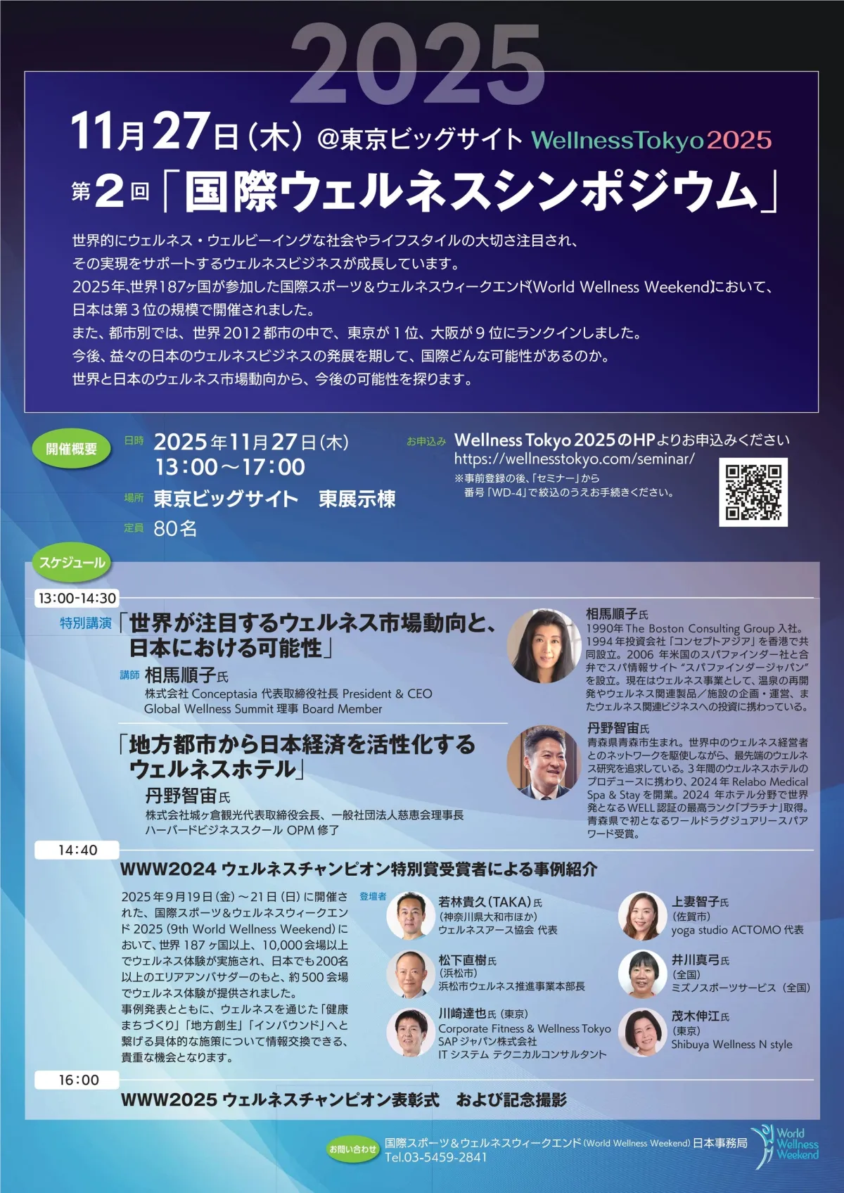今回のシンポジウムは、ウェルネス市場の新たな動きや可能性を直に体感するチャンスです。健康的なライフスタイルに興味がある方、ウェルネスビジネスに関わる方々へ、この貴重な機会をお見逃しなく!