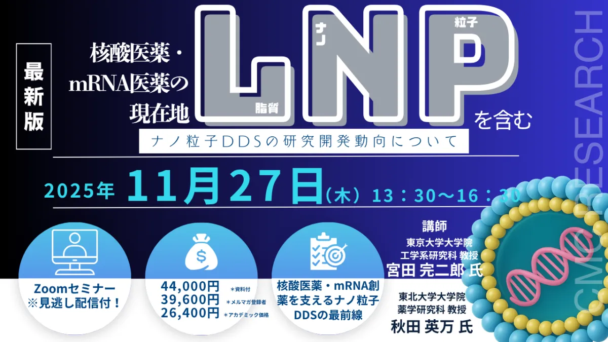 2025年11月27日(木)、(株)シーエムシー・リサーチが主催するライブ配信セミナー「核酸医薬・mRNA医薬の現在地―LNPを含むナノ粒子DDSの研究開発動向について―」が開催されます。このセミナーでは、東京大学の宮田完二郎教授と東北大学の秋田英万教授が講師を務め、mRNA医薬や脂質ナノ粒子(LNP)の研究開発の最新情報をお届けします。