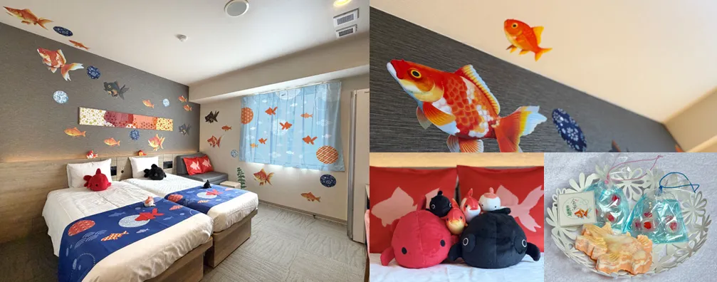 H.I.S.ホテルホールディングス(HISHH)が運営する変なホテル東京では、地域文化とつながりを強調した新宿泊体験がスタートします。11月21日(金)からオープンする「金魚ルーム」は、江戸川区の特性を生かしたアートな癒し空間です。この客室のデザインは、金魚をテーマにしており、宿泊される方には、金魚すくい飴や金魚形のバスボムといった特典も付いてきます。宿泊料金は1泊朝食付き18,000円から。