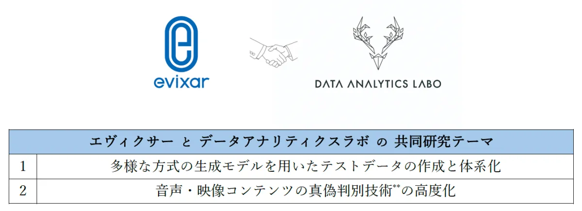 近年、SNSや生成AIの増加により、ネット上での偽情報やディープフェイクの問題が深刻化しています。特に、音声や映像の信頼性を確保するための技術的な対応が急務であり、国際的な標準化や国内実装が求められています。今回の共同研究では、エヴィクサーが開発した「Evixar Audio Forensics(EAF)」という偽情報対策用のクラウドシステムに、データアナリティクスラボが得意とするAIとデータ解析の技術を組み合わせます。