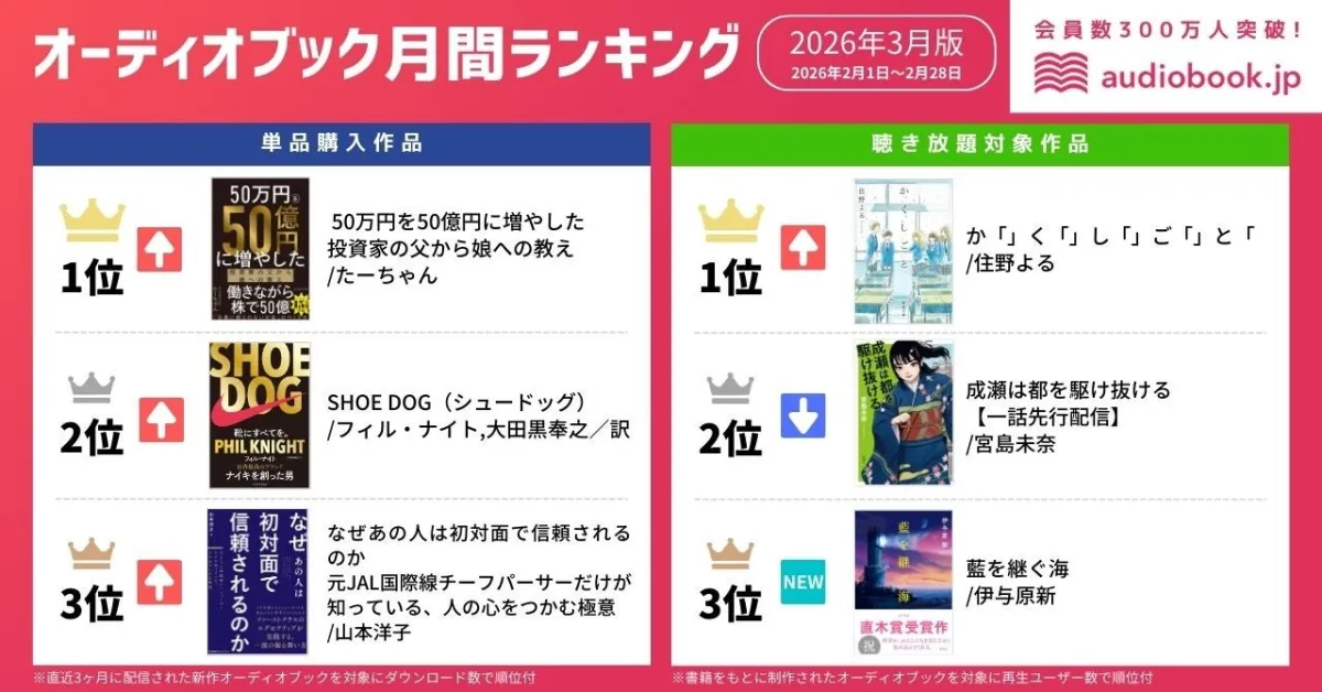 投資熱が高まる中、オーディオブックでもその影響が表れています。株式会社オトバンクが運営する「audiobook.jp」において、2026年3月のオーディオブック人気ランキングが発表されました。特に注目されたのが、「50万円を50億円に増やした 投資家の父から娘への教え」でした。