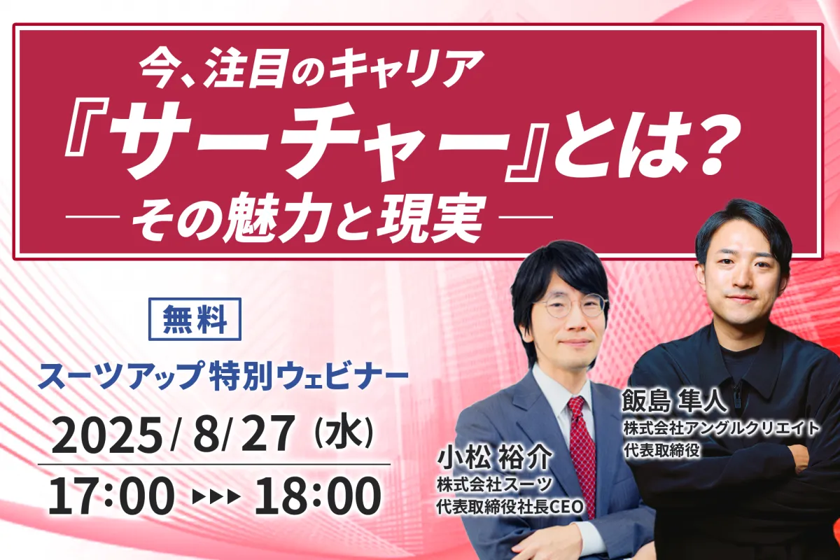 株式会社スーツが主催する特別ウェビナー「今、注目のキャリア『サーチャー』とは?その魅力と現実」が2025年8月27日(水)17時からオンラインで開催されます。本イベントは無料で参加でき、これからのキャリアの選択肢を広げる貴重な機会です。