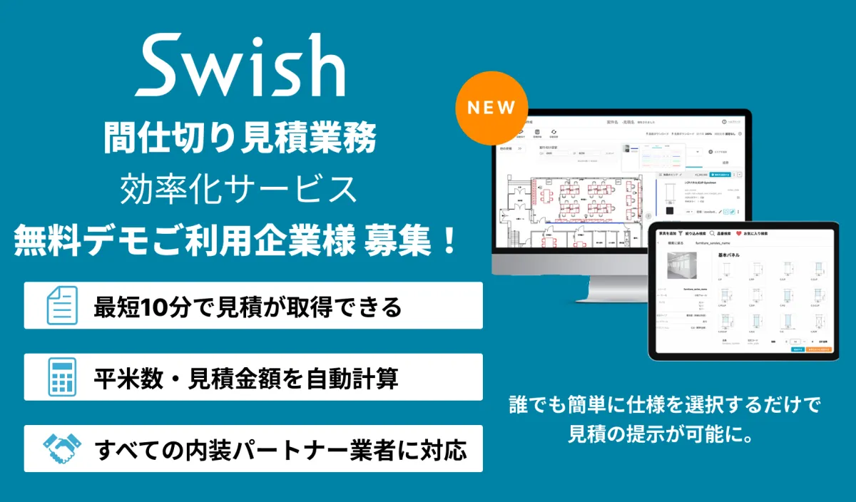 株式会社Swishは、間仕切りやオフィス家具の見積業務を効率化するだけでなく、今後は床工事や造作家具、さらには設備工事など、内装全体に対応するプラットフォームへと進化していく予定です。また、見積から発注、案件管理までをデジタル化し、業界全体のDXを実現することを目指しています。