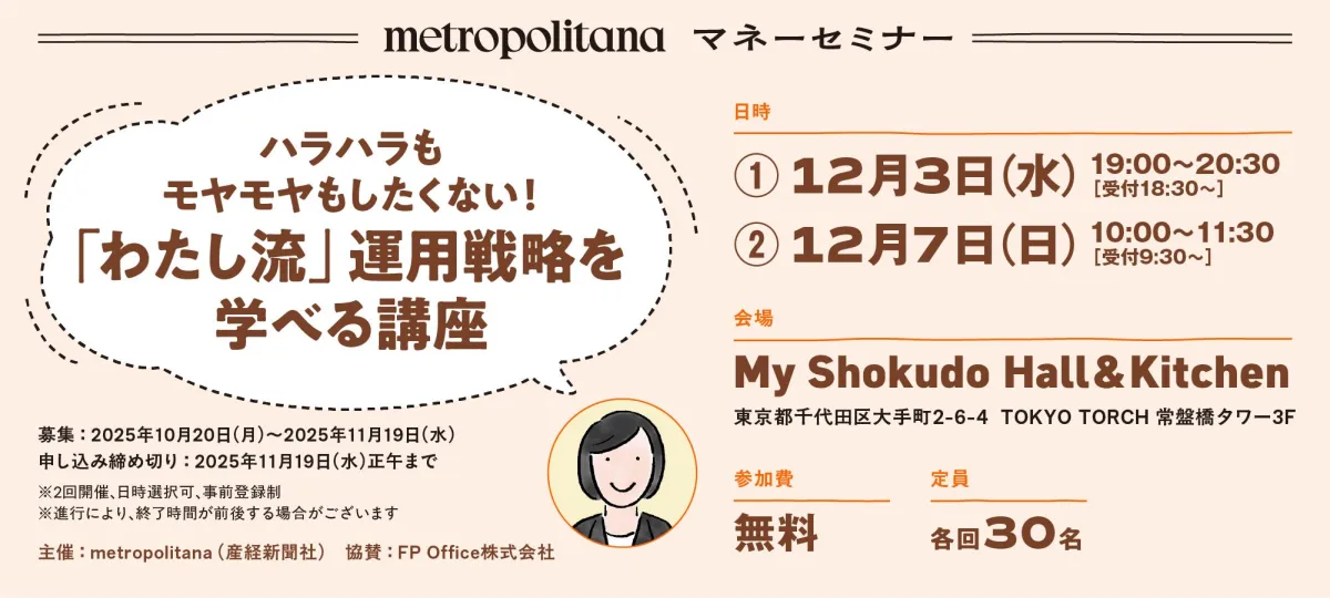資産運用を考えるとき、誰しもが期待と不安の入り交じった感情を抱くものです。日々変動する市場に翻弄されることもあれば、「本当にこの投資でいいのか?」という疑問に悩むこともあります。そんな方々に向けて、メトロポリターナが開催するマネーセミナーが、12月3日(水)と7日(日)の2日間、東京都大手町で開催されます。このセミナーでは、資産運用に興味がある初心者を対象に、「わたし流」という個々のライフスタイルに合った運用戦略を学びます。