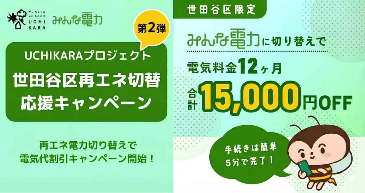 世田谷区が進める脱炭素化プロジェクト、「UCHIKARAプロジェクト」との連携で、12月1日(月)より「世田谷区再エネ切替応援キャンペーン(第2弾)」が始まります。この取り組みは家庭での再生可能エネルギーの利用をさらに促進することを目的としており、最大で15,000円の割引が提供されます。
