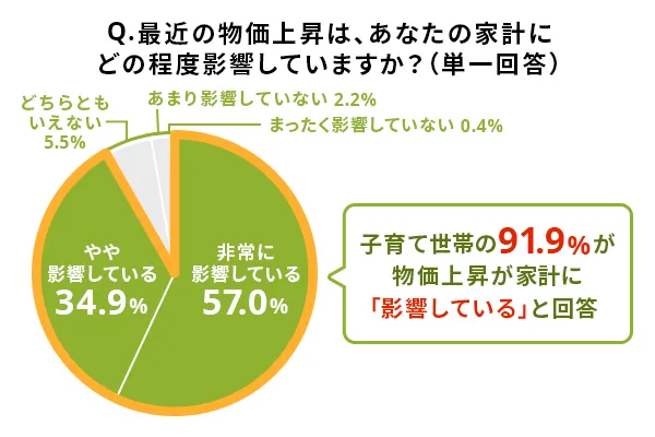 調査によると、91.9%の子育て世帯が物価の上昇によって家計に影響を実感しており、89.3%が食費の増加を感じています。特に、米、野菜、卵の値上がりが顕著であり、果物やお菓子、インスタント食品、肉類などは、コストを抑えるために購入を控えられる傾向があります。