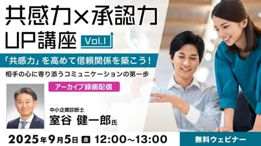 2025年9月5日(金)、株式会社クリーク・アンド・リバー社(C&R社)が主催するオンラインセミナー『共感力×承認力』UP講座Vol.1が、アーカイブ映像として無料で配信されます。このセミナーでは、相手の気持ちに寄り添うコミュニケーションスキルを学べるとあって、コミュニケーションに課題を感じる方々に特におすすめです。