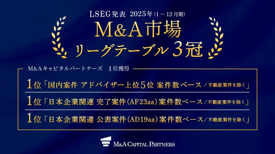 2025年版のM&A市場リーグテーブルにおいて、M&Aキャピタルパートナーズ株式会社(MACP)が3つの重要なカテゴリーで1位を取り、圧倒的な存在感を示しました。この栄誉ある設績には、「国内案件 案件数ベース」、「日本企業関連 完了案件 案件数ベース」、および「日本企業関連 公表案件 案件数ベース」が含まれています。特に「国内案件 案件数ベース」では3年連続の1位を獲得しており、業界内での信頼性と実績が伺えます。