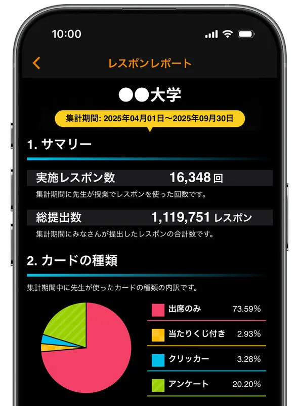 「教育機関向けrespon」は、現代の教育現場に必要不可欠なリアルタイムアンケートシステム及び出席管理システムです。このアプリでは、教員が授業ごとに用意する「カード」を通じて、学生の出席確認やアンケートを行うことができます。学生は教員から提示された「受付番号」を用いて、即座にアプリ上で回答を提出。その結果はリアルタイムで集計され、教員は瞬時に学生の理解度を把握することができます。
