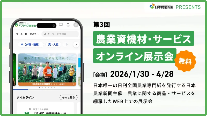 本日、東京都台東区の株式会社日本農業新聞主催による「第3回 農業資機材・サービス オンライン展示会」が幕を開けました。この展示会は2026年1月30日から4月28日までの約3か月間、全国の農家やJA関係者をはじめ、農業に関心のあるすべての方に向けて開催されます。