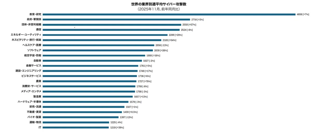 2025年11月、全体の組織が週平均2,003件の攻撃にさらされており、これは前月比で3%、昨年11月比で4%の増加を示しています。この背景には、活発化するランサムウェア攻撃や攻撃対象の拡大、そして組織での生成AIツール利用による情報漏えいリスクの増加が挙げられます。