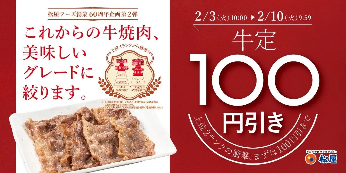 松屋フーズは、2026年で60周年を迎えるにあたり、特別なフェアを実施します。その名も「牛焼肉関連100円引きフェア」。開催期間は2026年2月3日(火)から2月10日(火)までの1週間。このお得な企画では、牛めし・カレー・定食など、松屋の人気メニューをお楽しみいただけます。
