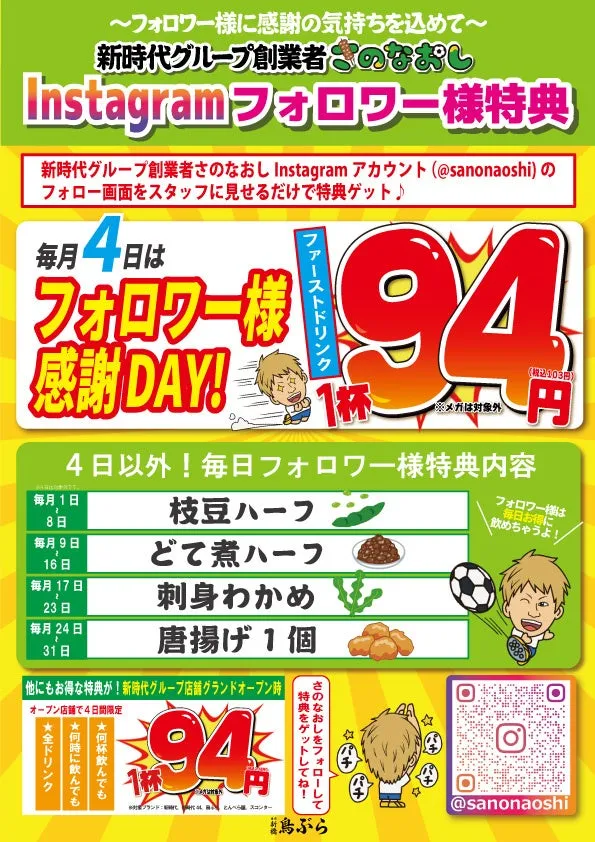 焼鳥酒場『鳥ぶら』が、感謝の気持ちを込めて「毎日フォロワー様特典」を実施中です。このキャンペーンでは、創業者さのなおしの公式Instagramアカウント(