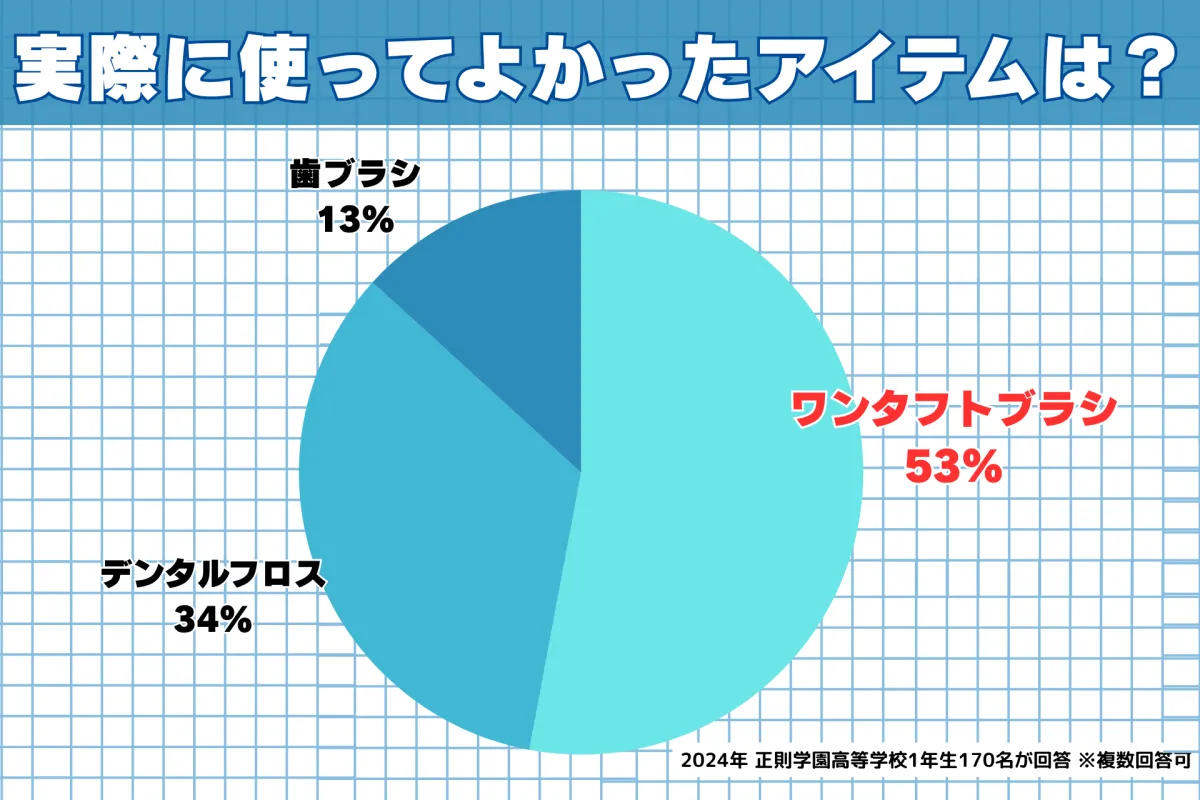 汚れがたまりやすい部分をケアするために、オーラルケアが推奨するのが「ワンタフトブラシ」です。この特別なブラシは、コンパクトな毛束で特定の部分をピンポイントで攻撃します。歯と歯の間、また歯と歯ぐきの境目など、一般的な歯ブラシでは届きにくい部分まできちんとケアすることができます。特筆すべき点は、男子高校生170人に行ったアンケートで、「使って良かったアイテム」の第1位に選ばれたことです。高校生からの評価も非常に高く、使いやすさや効果の実感がサポートされています。