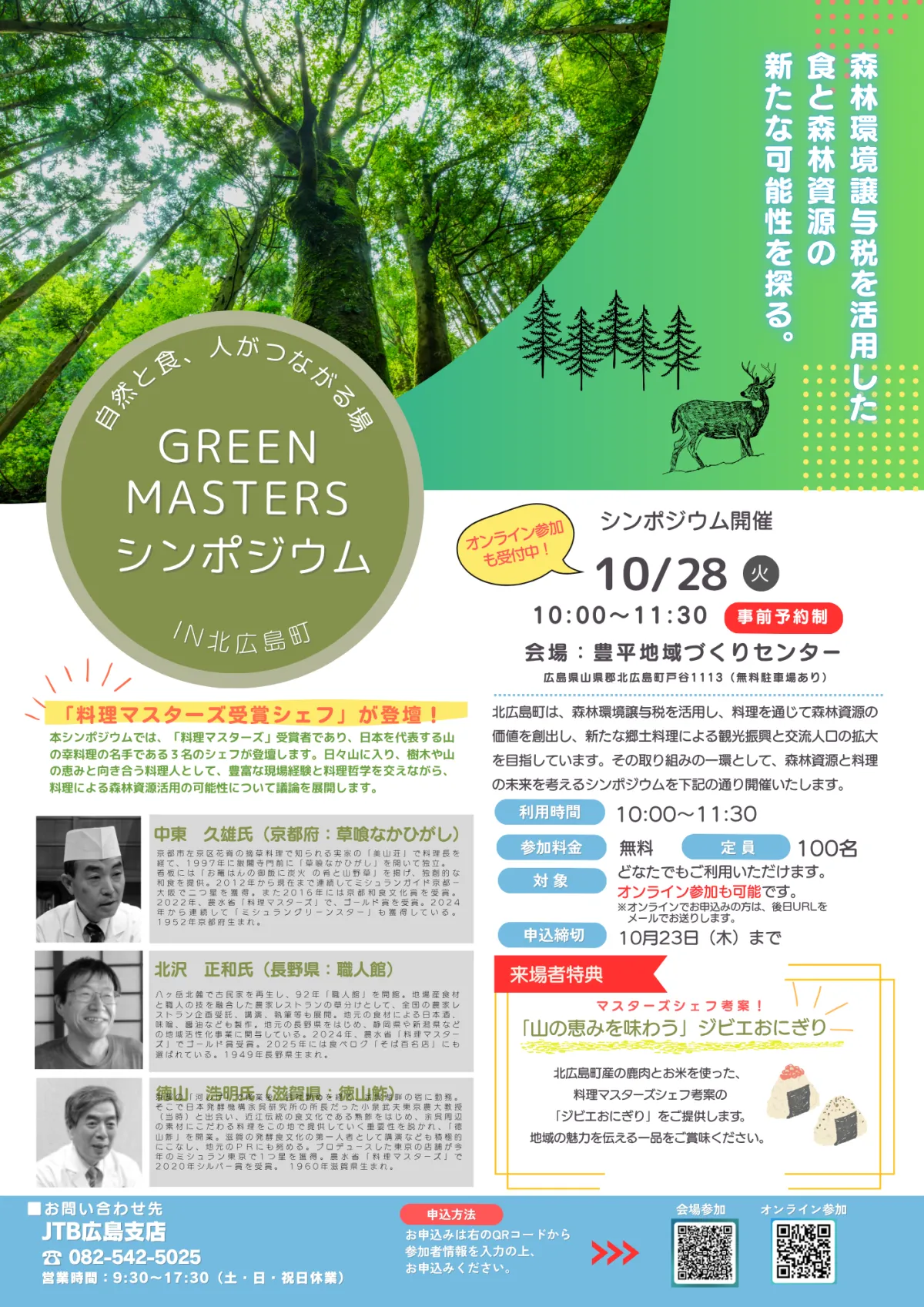 翌日の10月28日には、「グリーンマスターズ・シンポジウム」が開催されます。こちらには、日本を代表する山の幸料理の名手である中東久雄氏(草喰なかひがし)、北沢正和氏(職人館)、徳山浩明氏(徳山鮓)の三名が登壇し、料理を通じた森林資源の活用について討論を行います。この場では、北広島町特産のジビエを使った「ジビエおにぎり」も振る舞われる予定です。