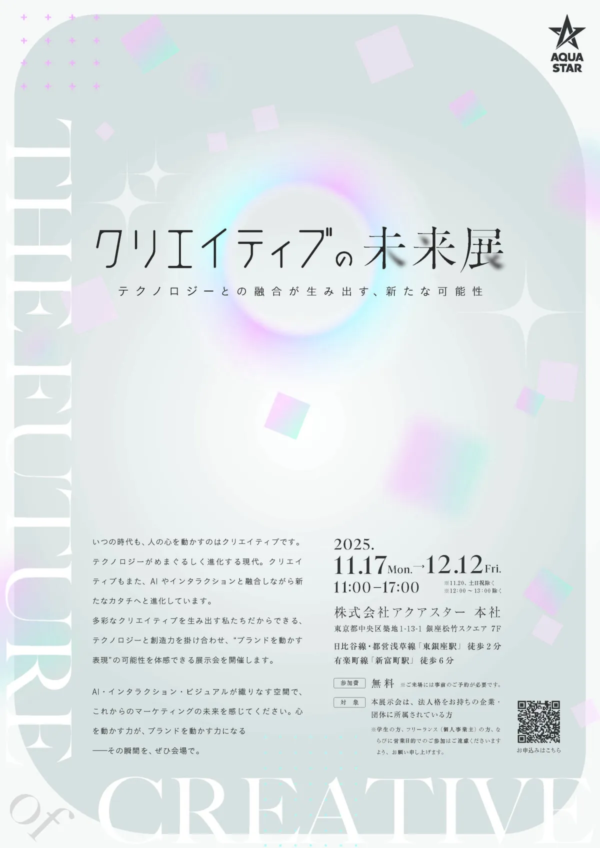 株式会社アクアスターの主催による「クリエイティブの未来展」が、2025年11月17日から12月12日にかけて開催されます。本イベントは、AI、インタラクション、デジタルデバイスなど、テクノロジーとクリエイティブの融合を体感できる展示イベントです。本社が位置する中央区築地にて、法人格を持つ企業や団体に所属する方々を対象に、無料で参加できますが、事前の登録が必要です。