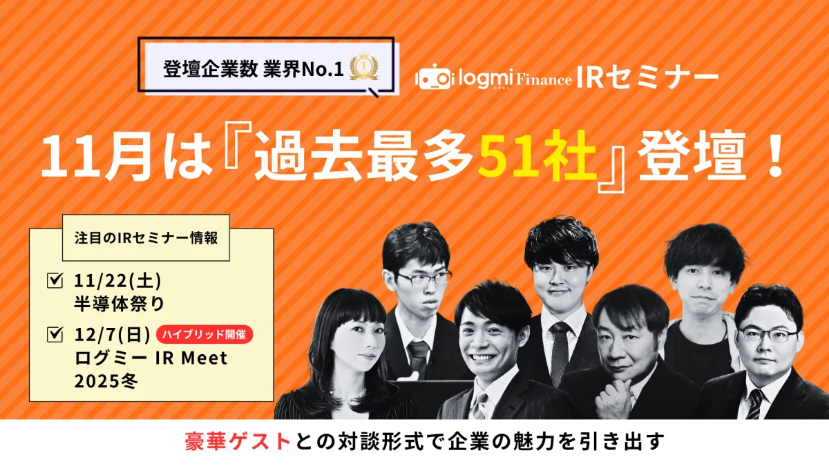 ログミーFinance」が、2025年11月に個人投資家向けのIRセミナーを開催します。その登壇企業数は過去最多の51社となり、企業と投資家にとって貴重な対話の場となります。特に注目されるのは、11月22日(土)の