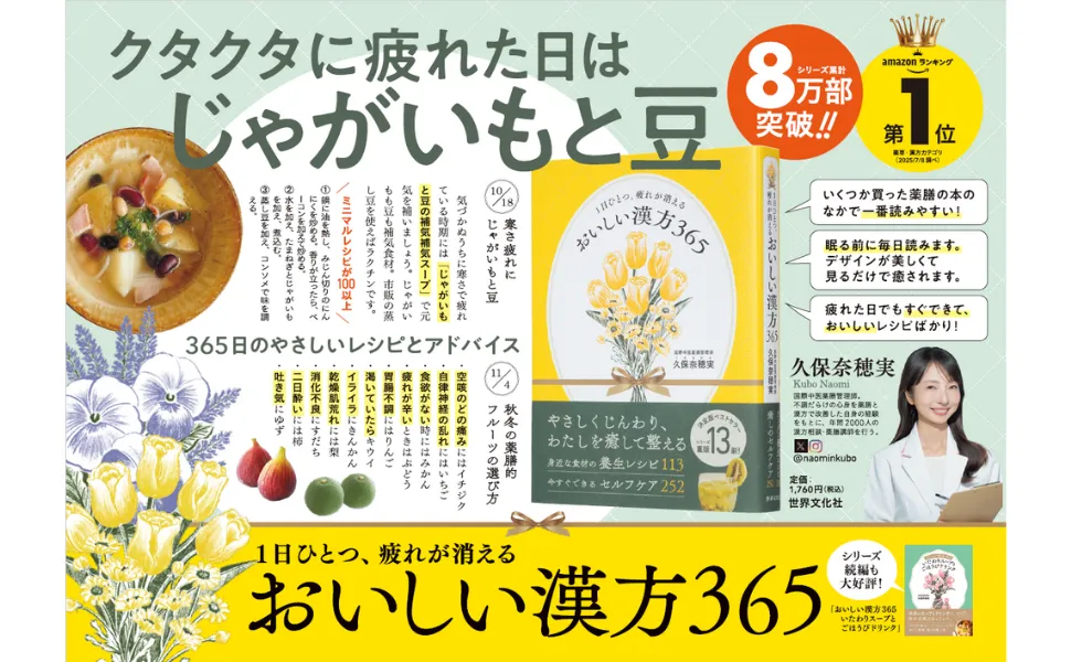 『おいしい漢方365』シリーズの第一弾『1日ひとつ、疲れが消える おいしい漢方365』は、SNSで人気の漢方アドバイザー・久保奈穂実先生が監修した実用書で、主に日常に取り入れやすい薬膳・セルフケア方法を紹介しています。113の養生レシピと252のセルフケア法が収録されており、食材を利用したスープやドリンクが心身の不調を和らげるとされています。