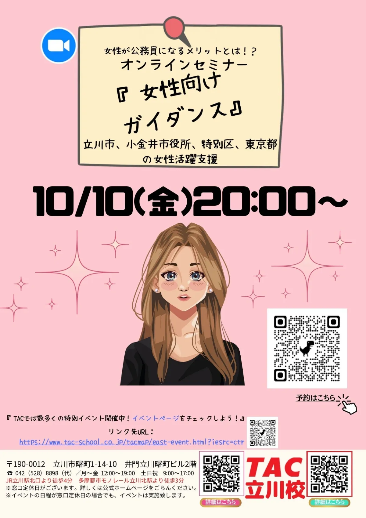 日本では多くの女性がライフスタイルの変化に対応するため、安定した職業として公務員を目指す傾向が高まっています。特に、育児や家庭との両立を考えた上でのキャリア選択として、公務員は魅力的な選択肢の一つです。今回、TAC公務員講座では、「女性が公務員になるメリット」について詳しく解説するオンラインセミナーを10月10日(金)の20:00から開催します。