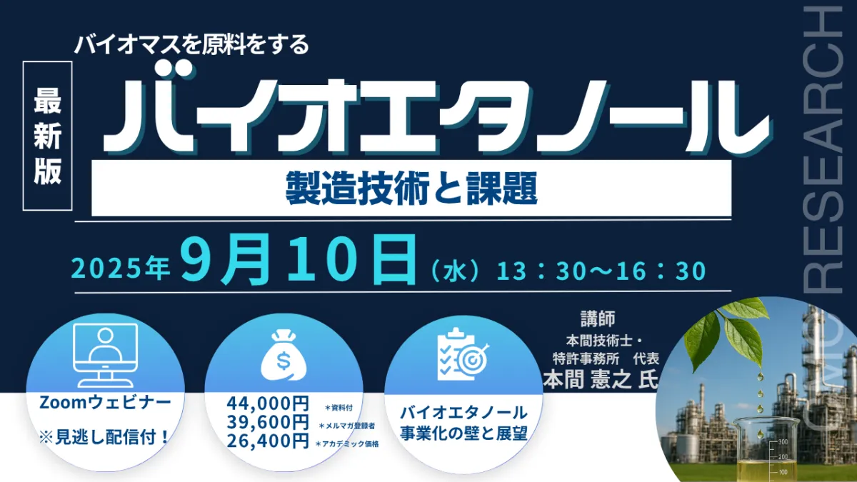 2025年の9月10日(水)、株式会社シーエムシー・リサーチが主催するウェビナー「バイオマスを原料とするバイオエタノール製造技術と課題」が開催されます。このセミナーは、カーボンニュートラルを目指す中で、バイオマスによるエネルギー資源の重要性を再確認することに焦点を当てています。
