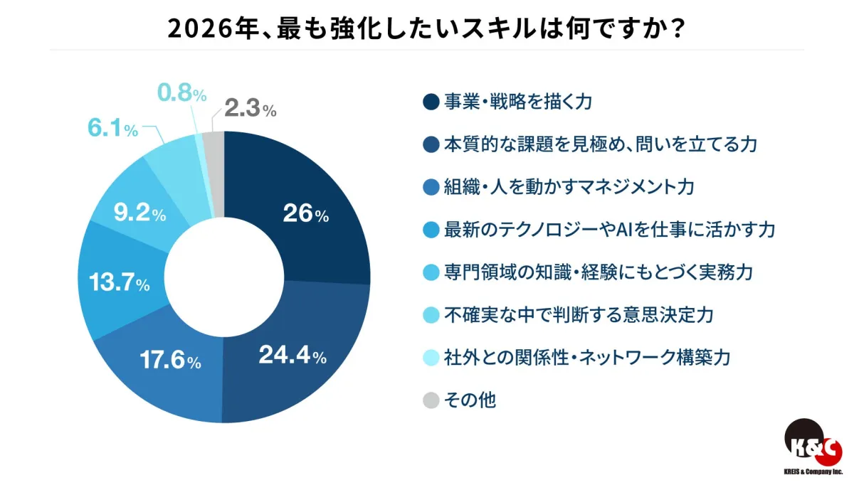 2026年に強化したいスキルとして最も高い関心を寄せられたのは「事業・戦略を描く力」で、26%の人々がこのスキルを重要視しています。次いで、本質的な課題を見極める力が24.4%、さらには組織や人を動かすマネジメント力が17.6%という結果となりました。この調査からは、AIや新技術を単に活用するだけでなく、その上のレイヤーにあたる事業推進や組織運営の重要性が重視されていることが伺えます。