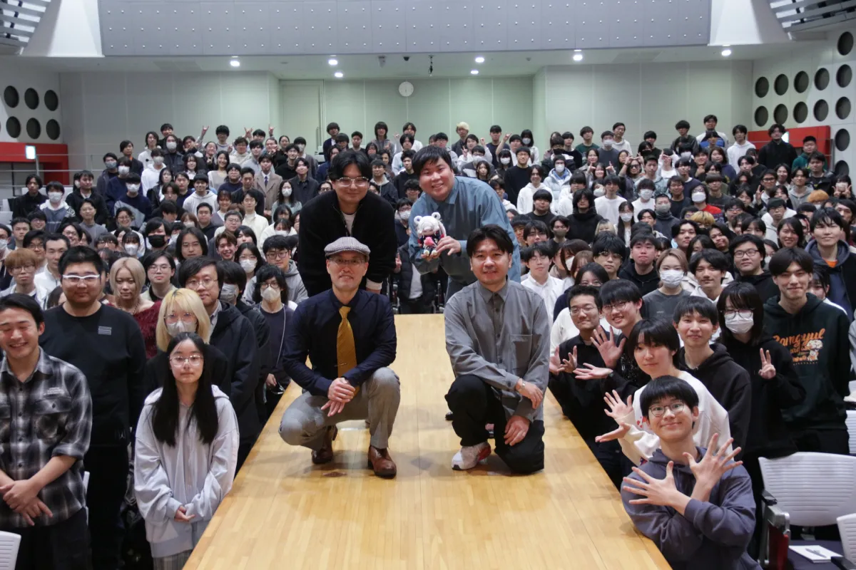 イベントには、山下監督を始め、キャラクターデザイン担当のへちま氏、CG監督の町田政彌氏、背景監督の草間徹也氏が登壇し、アニメーションプロデューサーの桃原一真氏がMCを努めました。学生約400人が集まったこの講演では、監督やスタッフが自身の業務や制作の裏話を語り、質疑応答を通じて学生との活発なコミュニケーションが行われました。