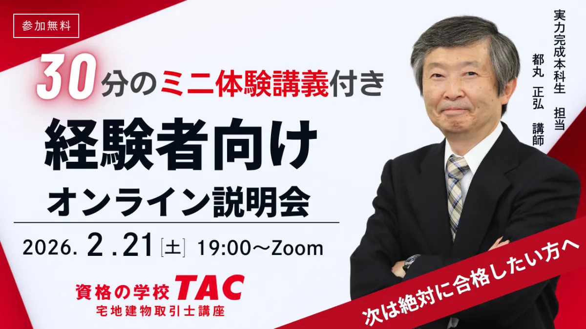2026年2月21日(土)19:00から、TAC宅建士講座が特別なオンライン説明会を開催します。経験者向けのこのイベントでは、特に再挑戦したい方や学習を進めたい方に向けた内容が用意されています。受講者は、Zoomを通じて参加でき、参加費は無料で手軽にご参加いただけます。