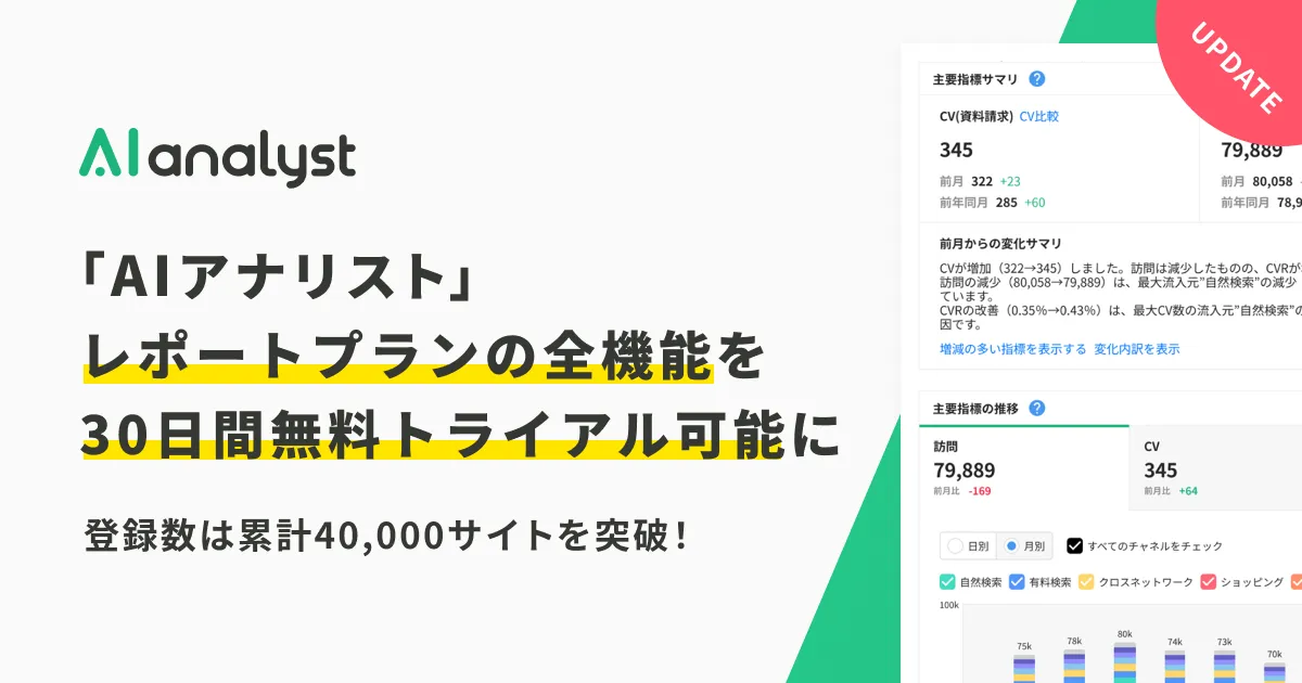 デジタルマーケティングツール、「AIアナリスト」が新しい「レポートプラン」の無料トライアルを提供開始しました。このトライアルは、今まで有料で提供されていたすべての機能を、最大30日間にわたって利用できる貴重な機会です。実際に試すことで、その使いやすさと効果を実感してみましょう。