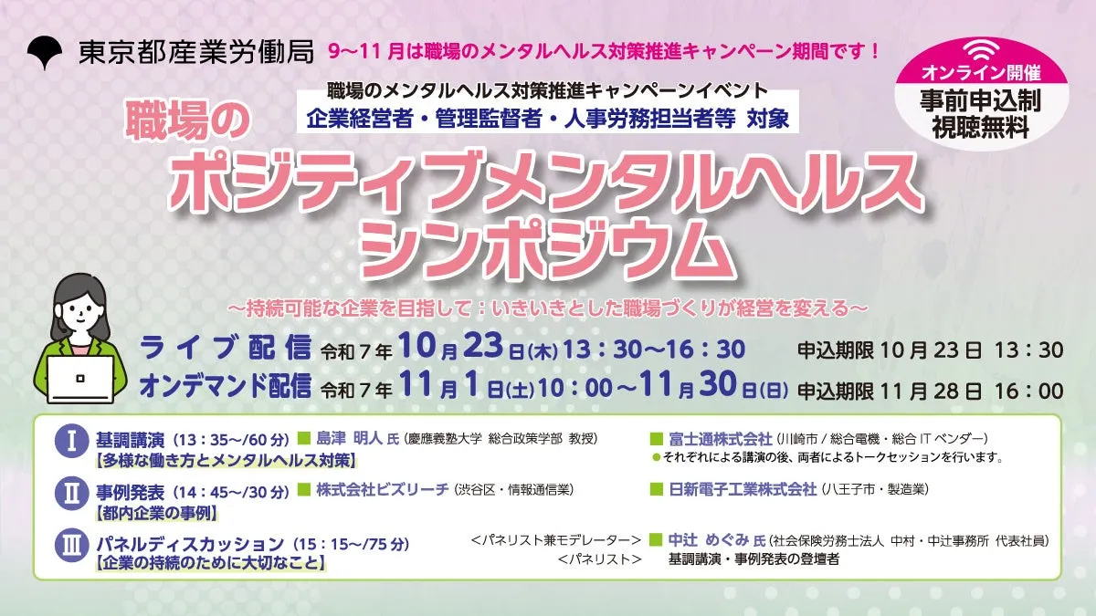 東京都が主催する「職場のポジティブメンタルヘルスシンポジウム」と、その後に行われるオンライン相談会が、2023年10月23日から11月中旬にかけて開催されます。本事業は、特に企業経営者や人事労務担当者を対象に、現代の働き方に焦点を当てた重要な内容が用意されています。これにより、企業の生産性を高めるためのメンタルヘルス対策が強調されます。