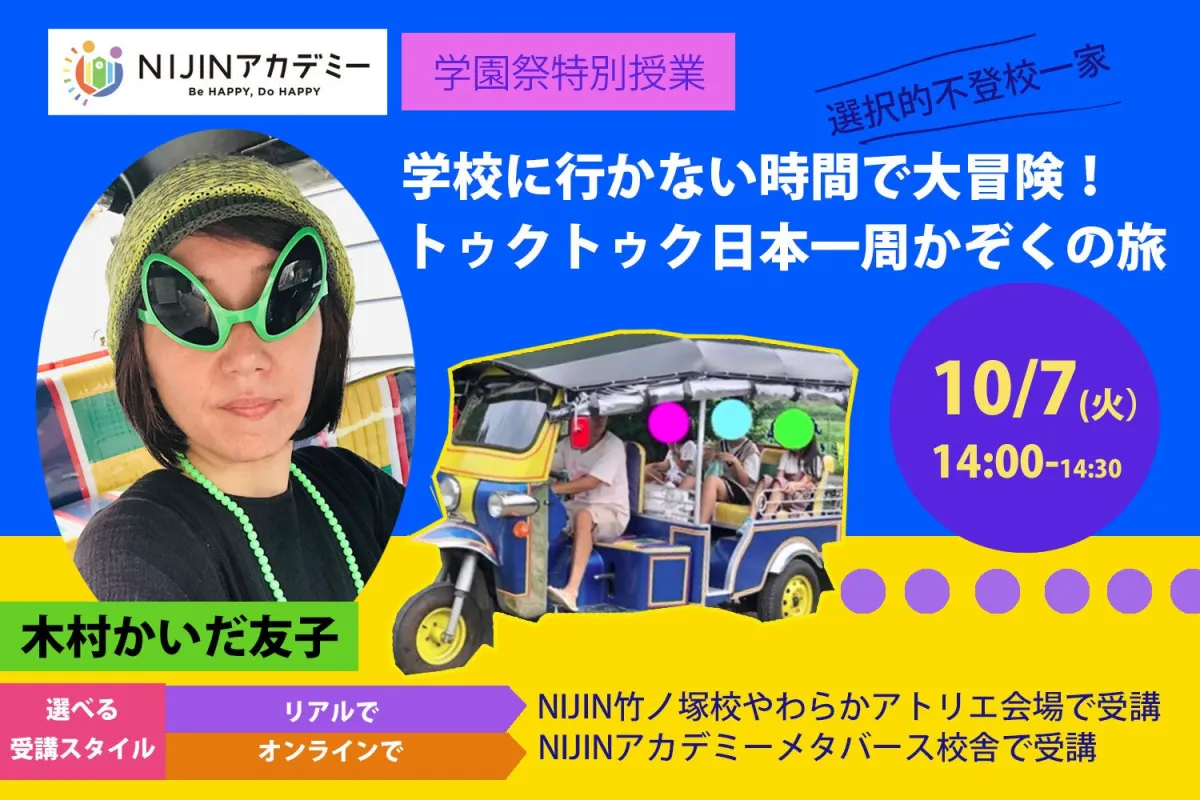 2025年10月7日、東京都足立区のNIJINアカデミー竹ノ塚校やわらかアトリエで、不登校の子どもたちに向けた特別な授業が行われます。この授業の講師は、「おかあ」こと木村かいだ友子さんです。木村さんの家族は、トゥクトゥクを使って日本一周の旅をしながら、学校に行かずに学び続けた経験を持っています。彼女は、選択的不登校の理念のもと、様々な人の考え方や暮らしに触れながら深く学ぶことができたと語ります。