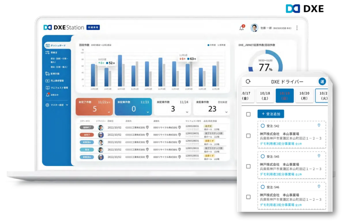 DXE Stationは、産業廃棄物の排出から処理までを一元管理するデジタルシステムです。従来の手間のかかる業務を劇的に効率化し、直感的な操作が可能なユーザーフレンドリーなデザインが特徴です。「パソコンが苦手」という方でも、問題なく操作できる設計になっています。