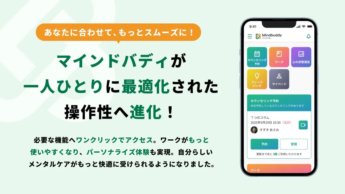 『マインドバディ』は、実際に生涯で10人に1人が経験すると言われるメンタルヘルスの問題を軽減するためのサービスです。これまでも多くの利用者に支持されてきましたが、利用者の増加に伴い、アプリの機能が複雑化。特にカウンセリングやワーク、心理尺度の利用が難しいと感じる声が多く聞かれました。