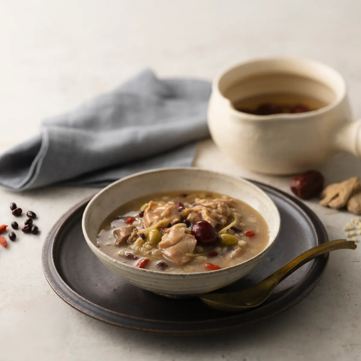 このスープ粥の最大の特徴は、具材の豊富さです。薬膳の知恵を基に選ばれた国産鶏、なつめ、クコの実、小豆、枝豆は、それぞれの旨味や食感を活かし、食べ応えのある一杯に仕上げられています。これにより、健康を気遣う方々にも満足感を与えることができるのです。