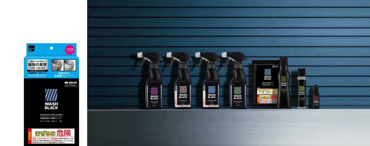 これまでに『matsukiyo WASHBLACK』シリーズは、水アカ落としやコゲ落とし、バスクリーナー、トイレクリーナー、エリそで用洗剤、シミとり洗剤などを展開し、プロ並みの高い洗浄力で多くの人々から支持を受けています。新商品の特徴は、特許技術を用いた高濃度塩素と強アルカリ成分を合わせた独自の処方にあります。