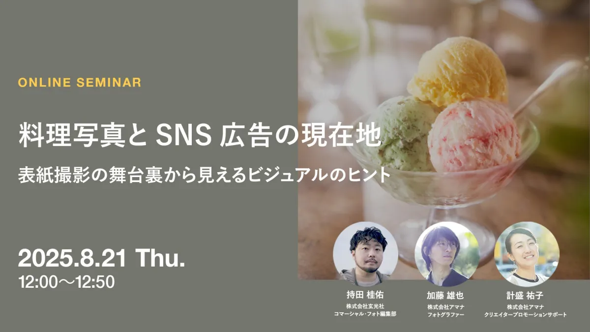 2025年8月21日、東京都品川区の株式会社アマナが主催するウェビナーが開催されます。そのテーマは『料理写真とSNS広告の現在地 ― 表紙撮影の舞台裏から見えるビジュアルのヒント』。現代の広告シーンにおいて、料理写真は単なるビジュアルコンテンツではありません。感情を揺さぶり、消費者に強い印象を与える重要な要素です。本ウェビナーでは、この料理写真の魅力とその制作過程について深く探ります。
