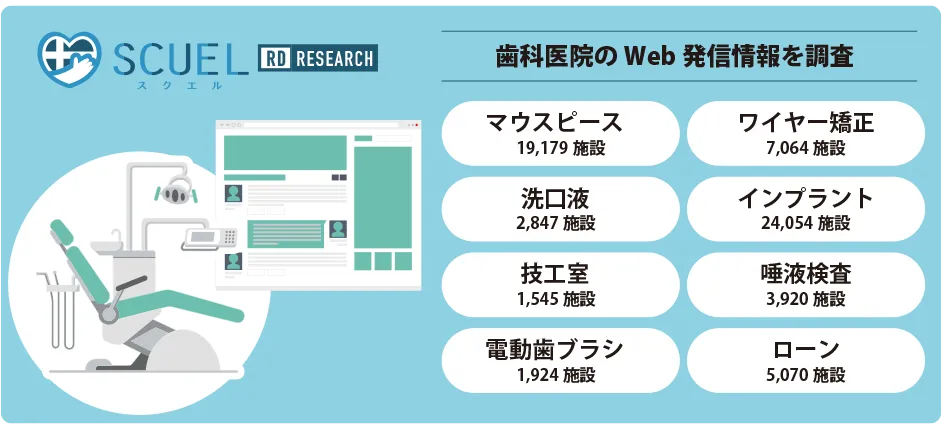 このサービスは、全国約3万件の歯科医院の公式ホームページから収集したデータをもとに、医院の関心領域やマーケティング戦略を分析するものです。これまで、歯科医療のターゲティングは「診療科目」や「専門医資格」などに依存していましたが、「SCUEL RD 歯科版」は新たに医院の発信内容を分析することで、より具体的な実態を把握できます。