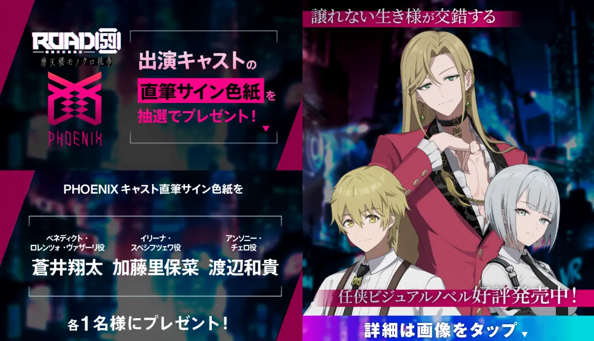 株式会社ブシロードが手がける新作ビジュアルノベルゲーム「ROAD59 -新時代任侠特区- 摩天楼モノクロ抗争」の発売を記念し、出演キャストの直筆サイン色紙が当たるキャンペーンがスタートしました。このキャンペーンでは、豪華キャストのサイン色紙が抽選でプレゼントされるチャンスがあります。