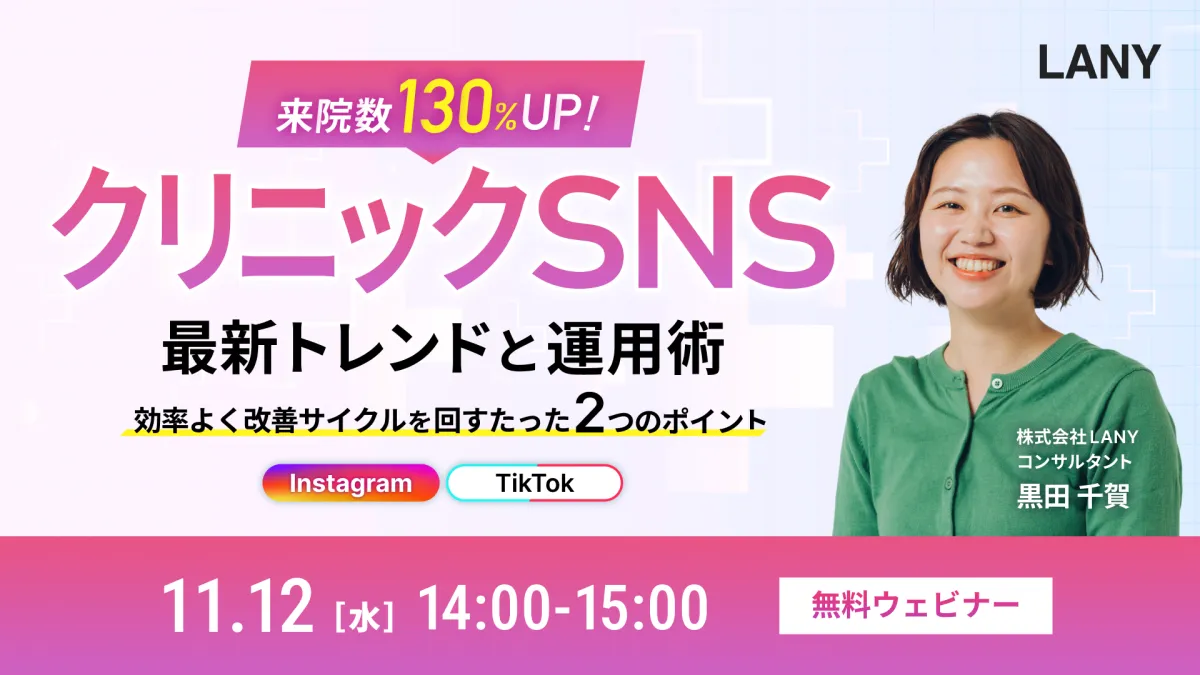 医療業界におけるSNSの利用がますます重要となる中、株式会社LANYが「来院数130%UP!クリニックSNSの最新トレンドと運用術」というテーマで、無料ウェビナーを開催することが決まりました。このウェビナーは2025年11月12日(水)14:00から15:00に行われます。