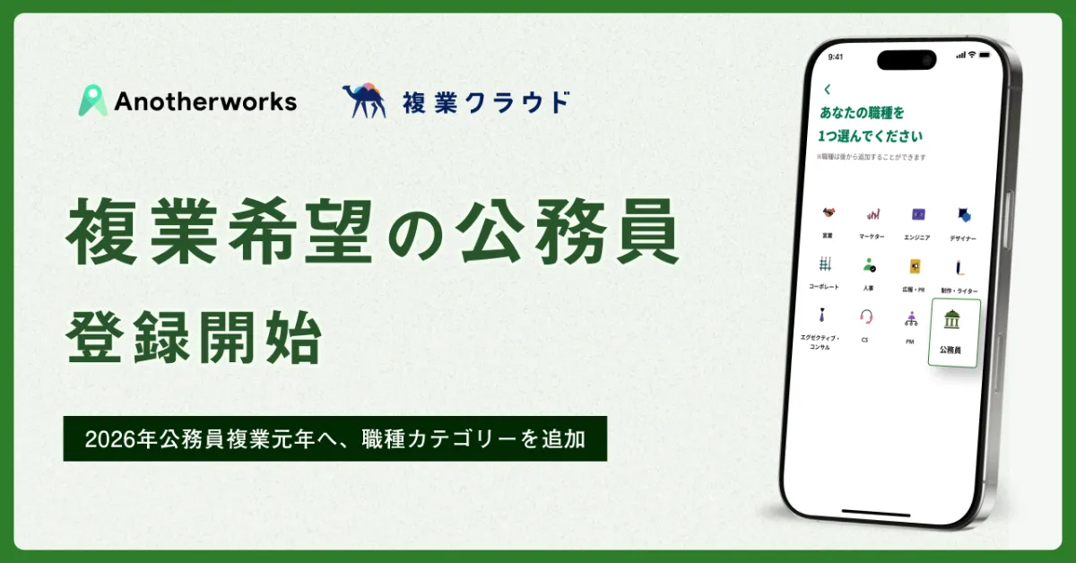 2025年12月、株式会社Another worksが運営する複業マッチングプラットフォーム「複業クラウド」が、公務員の登録受付を開始します。また、2026年は「公務員複業元年」と位置付けられ、全国の自治体や職員が新しいキャリアに挑戦するためのサポートが提供されることになります。