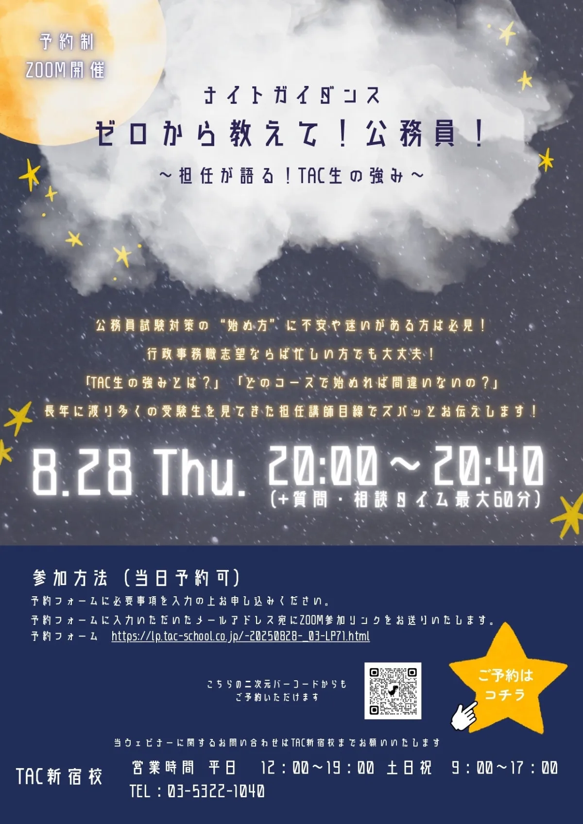 公務員試験は、未来のキャリアを左右する重要な試練です。このナイトガイダンスを通じて、安心して試験対策に取り組むための情報を手に入れ、新しいスタートを切ってみませんか?興味のある方はぜひ参加して、講師の的確なアドバイスを受け取ってください。