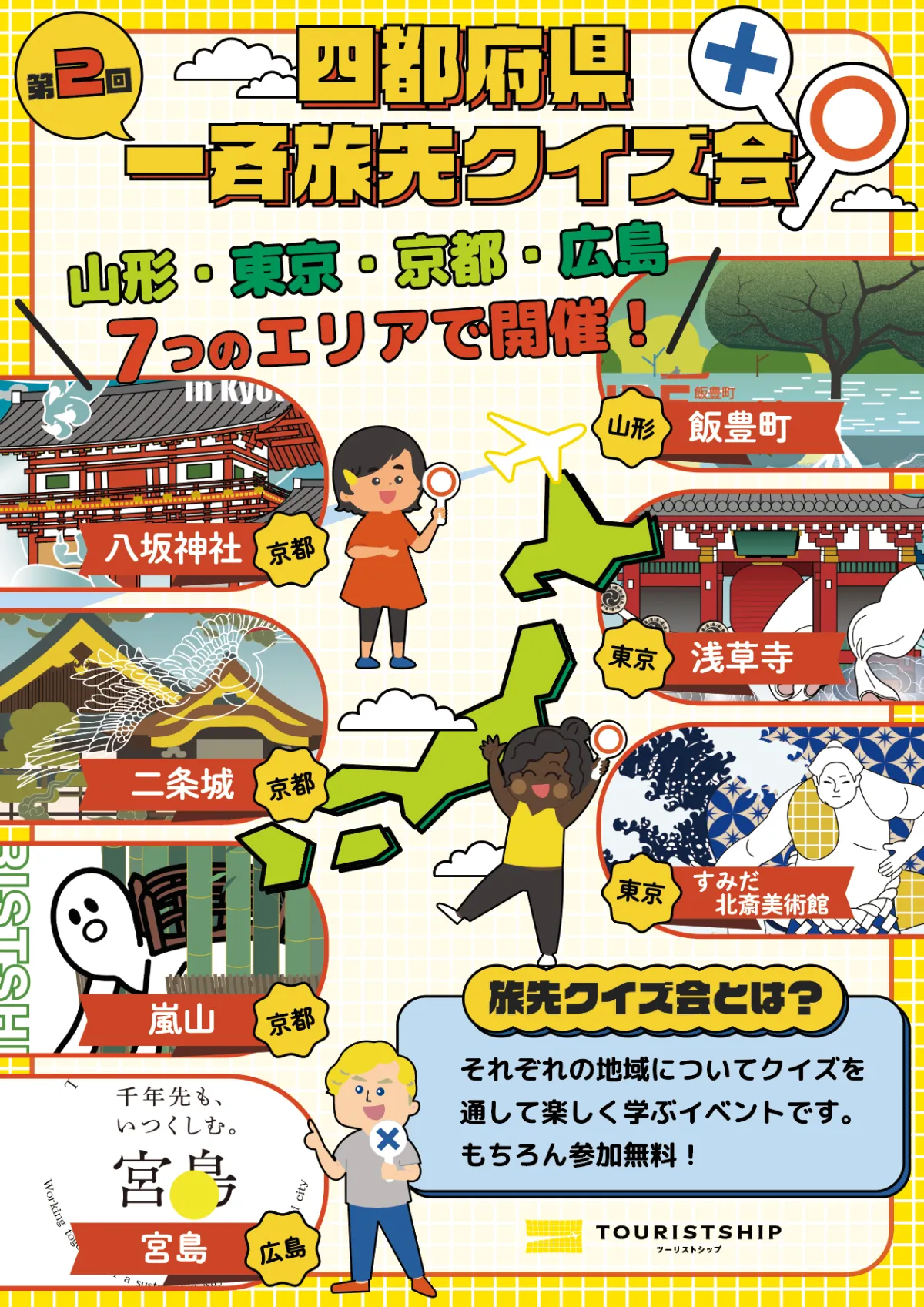 2025年10月25日、山形、東京、京都、広島の4つの都府県で「第2回一斉旅先クイズ会」が開催されます。このイベントは、観光地の魅力をクイズ形式で楽しみながら学べる体験型のイベントです。昨年の成功を受け、観光マナーの啓発をさらに進めるため、地方自治体や観光団体が協力し、全国で一斉に実施します。