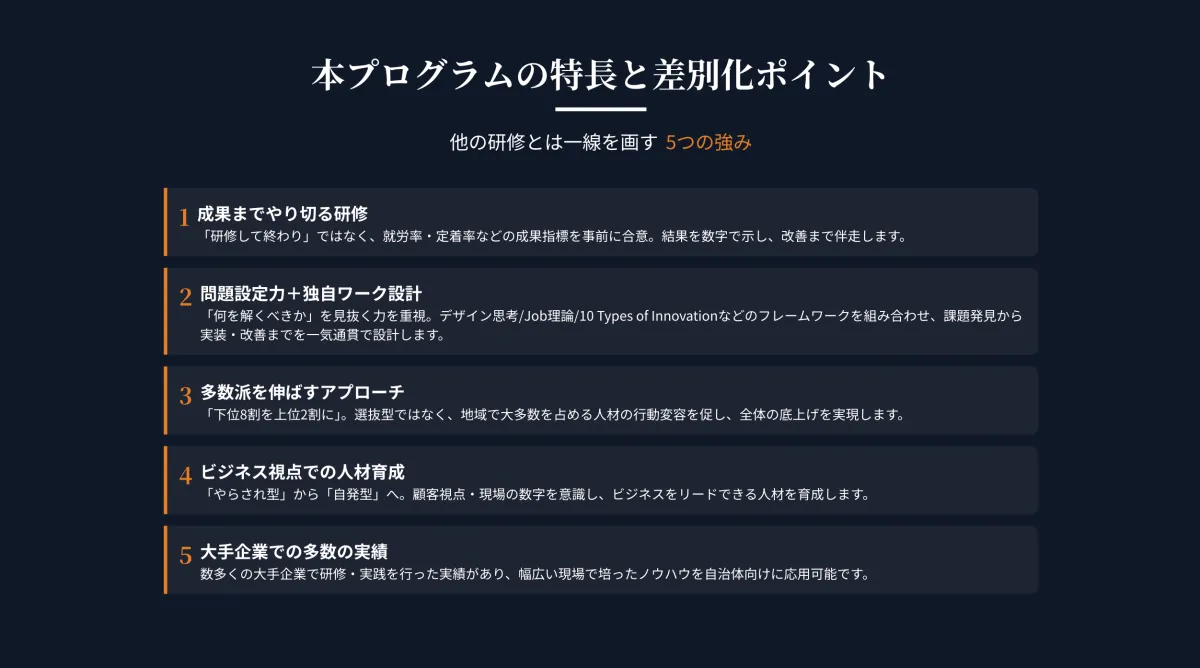 従来の人材育成プログラムでは、「研修して終わり」といった形態が多く見受けられます。しかし、ディシプリナでは「成果までやり切る研修」を掲げ、実際の業務に即座に活かせるスキルセットを提供することを目指しています。また、プログラム内では