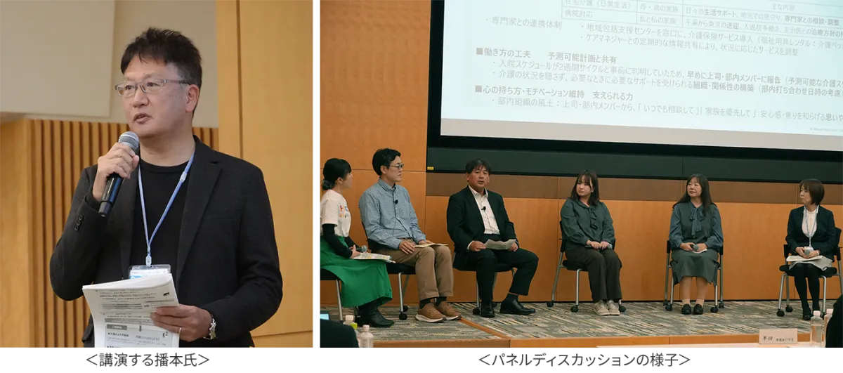 パネルディスカッションでは、ビジネスケアラーとして活躍している社員4名が自らの経験を語り合いました。彼らは、業務の合間に介護を進めるために、電話からSMSやLINEに連絡手段を変えるなど、柔軟な働き方を取り入れています。また、遠隔地勤務制度を活用し、状況を周囲に共有することで、協力を得る努力をしています。チーム内の信頼関係を深めるため、定期的に介護の状況を話し合う席を設けることも有効です。