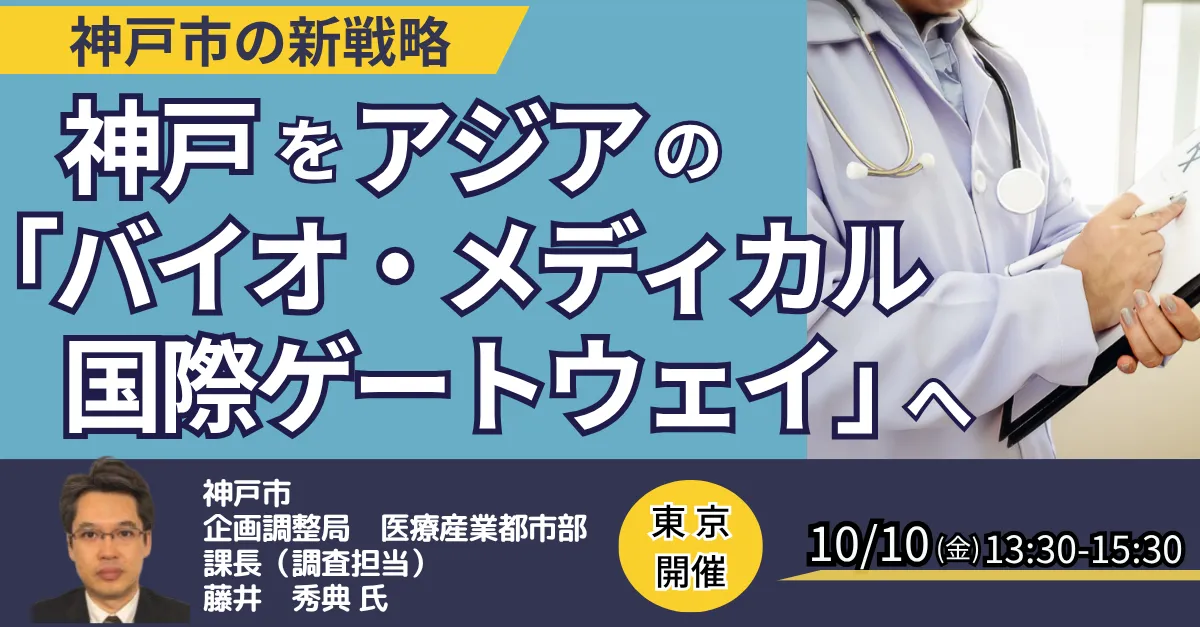 2025年10月10日(金)の午後に、東京都内で「神戸を、アジアのバイオ・メディカル国際ゲートウェイへ」というテーマでセミナーが開催されます。このセミナーでは、神戸市の企画調整局医療産業都市部の課長である藤井秀典氏が講師として招かれ、現在の神戸市の医療戦略やその成果について詳しく説明してくれる予定です。