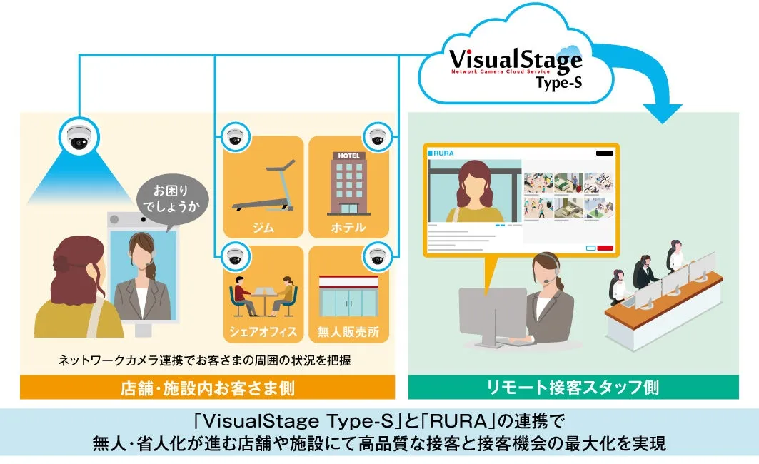 店舗運営において、お客さまとのコミュニケーションの質は極めて重要です。これまでの対面接客では目の前のお客様しか見えず、時には接客の対応漏れが発生することもありました。そこで登場するのが、キヤノンのクラウド型録画サービス「VisualStage Type-S」とタイムリープの遠隔接客サービス「RURA」の連携です。この連携によって、リモート接客スタッフは店舗内の全体像を把握することが可能となり、よりスムーズかつ適切な接客が実現します。